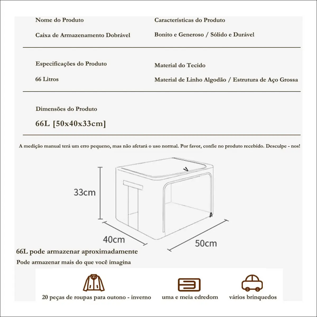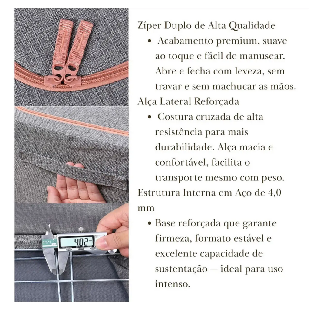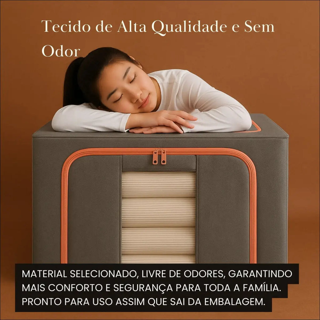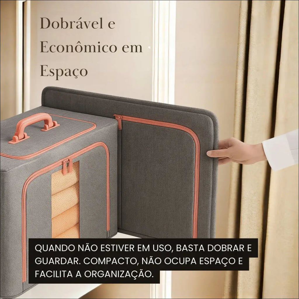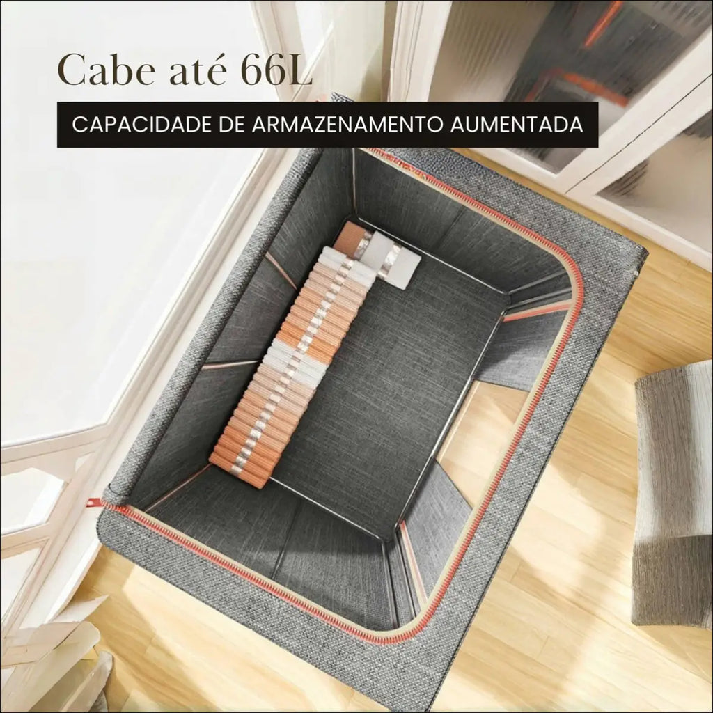 Grande Capacidade Interna: Armazena até 66 litros – comporta 20 peças de roupa ou 1,5 edredom.